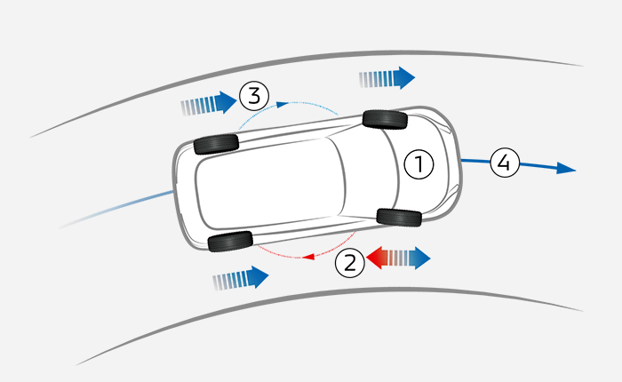2. ブレーキを制御するAYCとASC、ABSを統合し、左右輪間の駆動/制動力を制御。